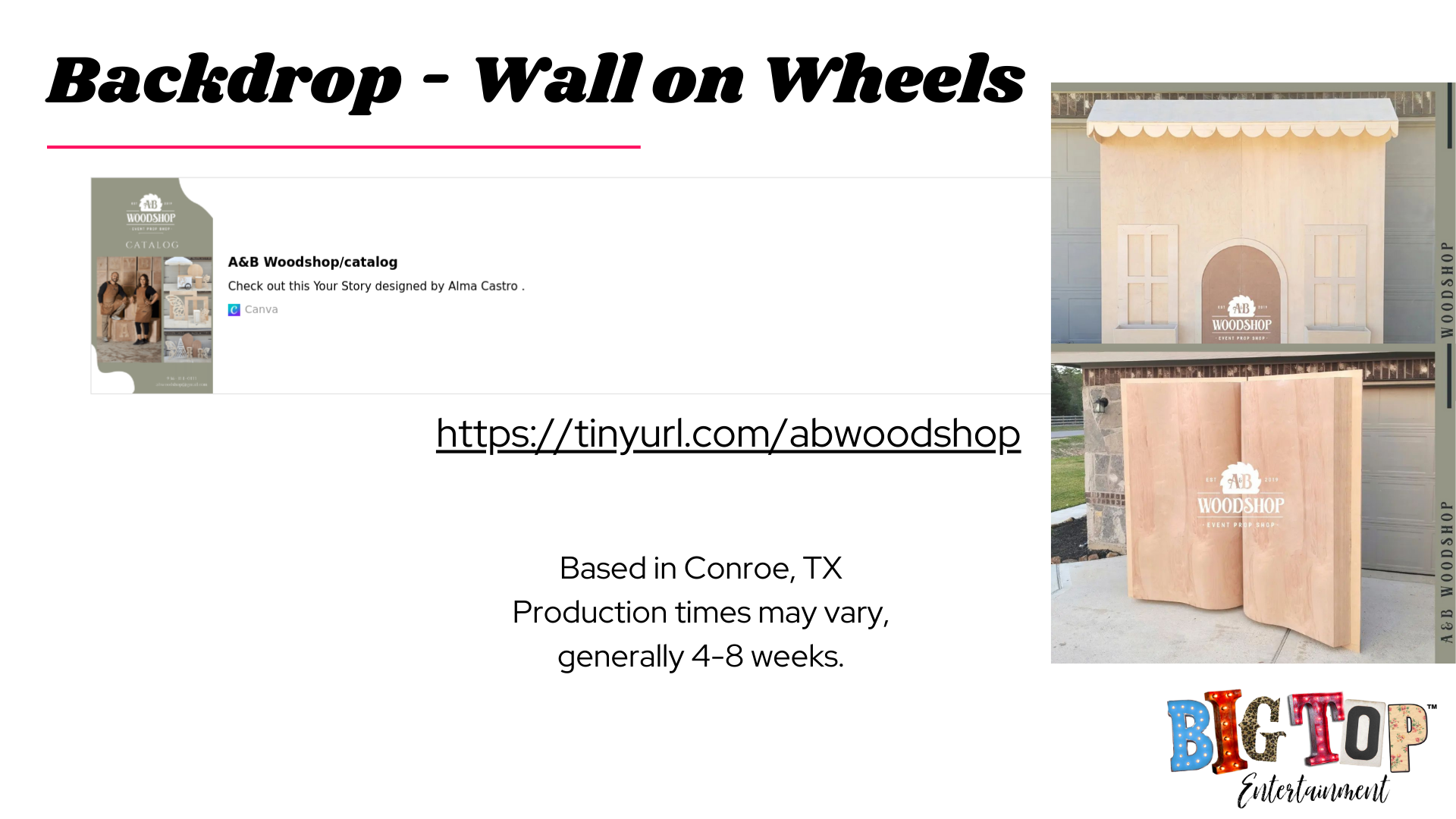 Based in Conroe, TX, production times may vary generally display pieces are available in 4-8 weeks. Can custom create designs. Most of their designs are built with the intention of being put together and taken apart for transport.