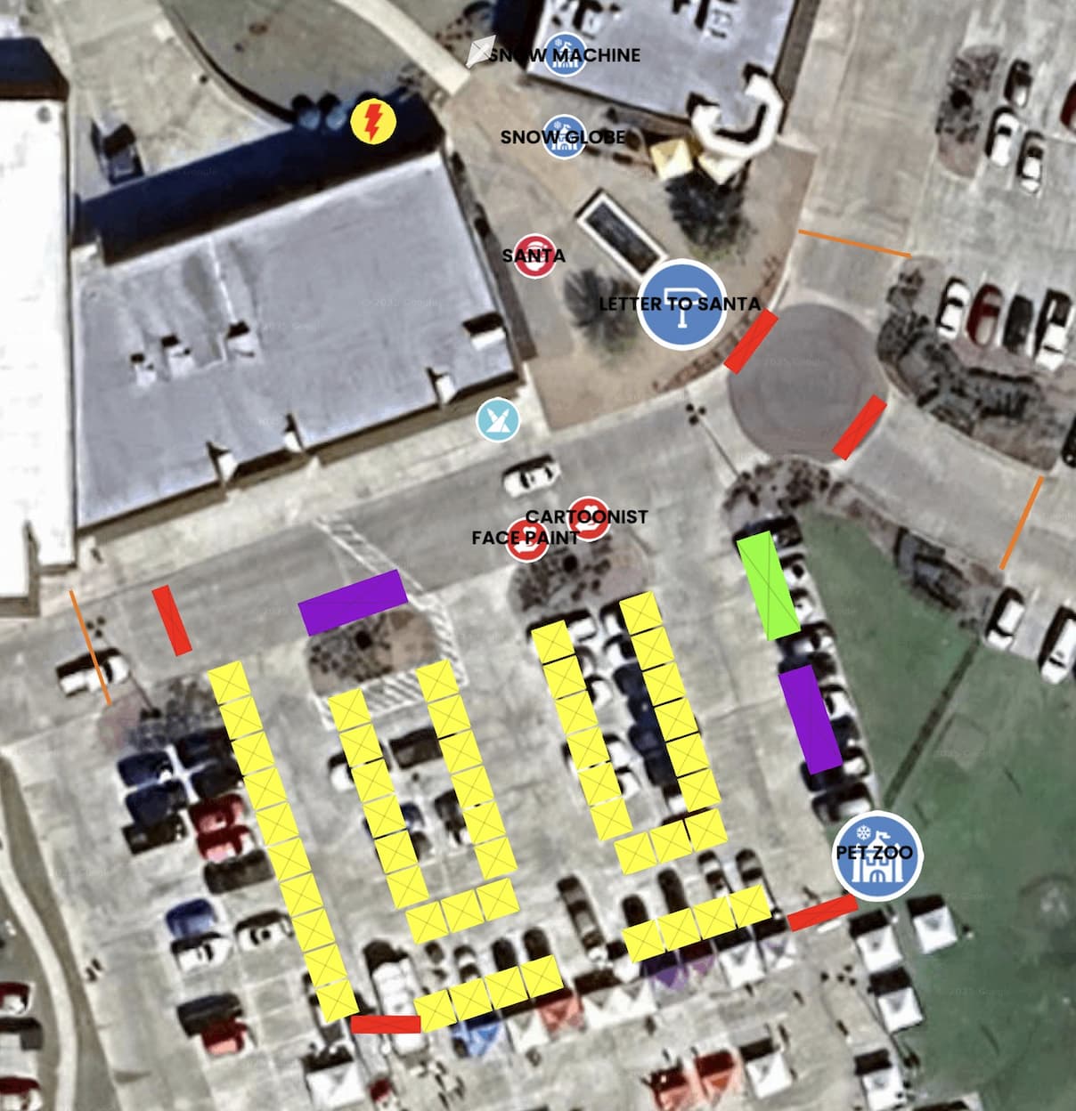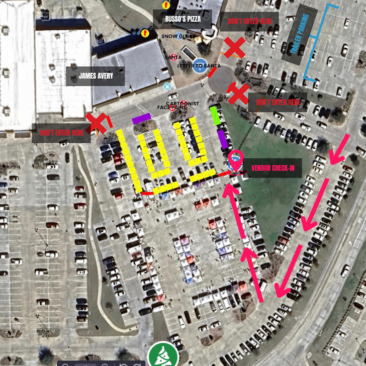 12pm-4:30pm: Exhibitor Move-In (Line up where pink arrows on map below are or park in parking lot on map below to dolly in.. The unload area is tight so please be patient if you are trying to get your car closer to your booth, we will do our best to accomidate.)